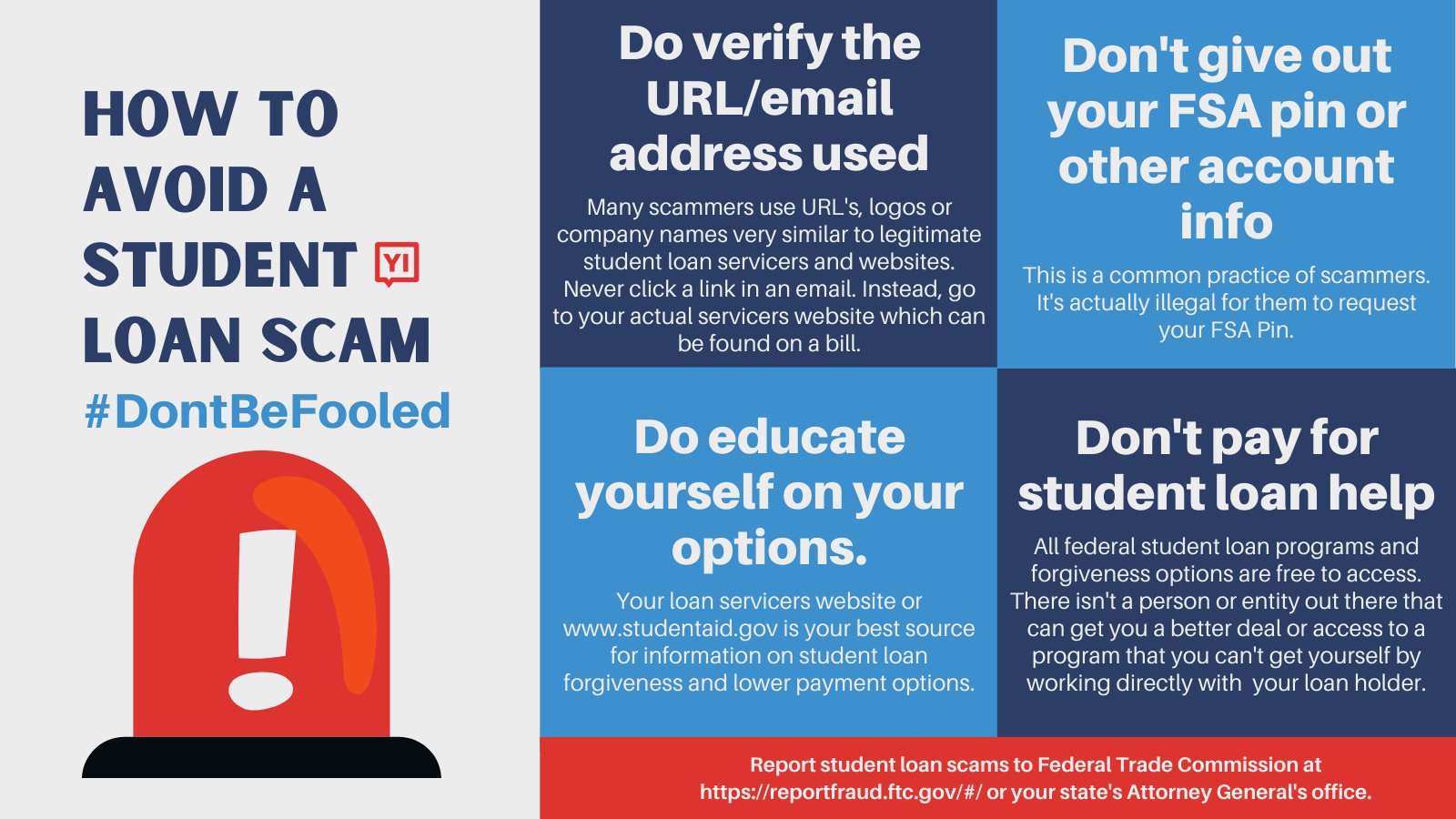 How to report student loan scams. With so many people impacted by the COVID-19 pandemic last year the government put a pause on federal. If you believe you are a victim of a student loan aid scam you can also contact the Federal Trade Commission FTC and file a complaint with the FTC. You can also send your.